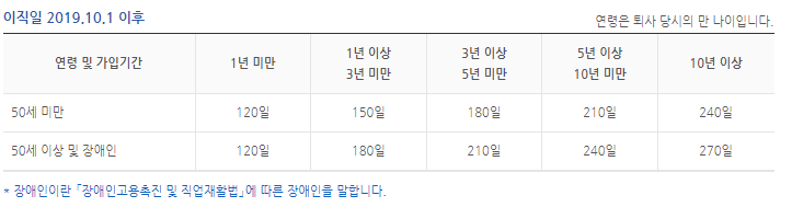 (이직일이 2019.10.1 이전은 퇴직 전 평균임금의 50% × 소정급여일수)