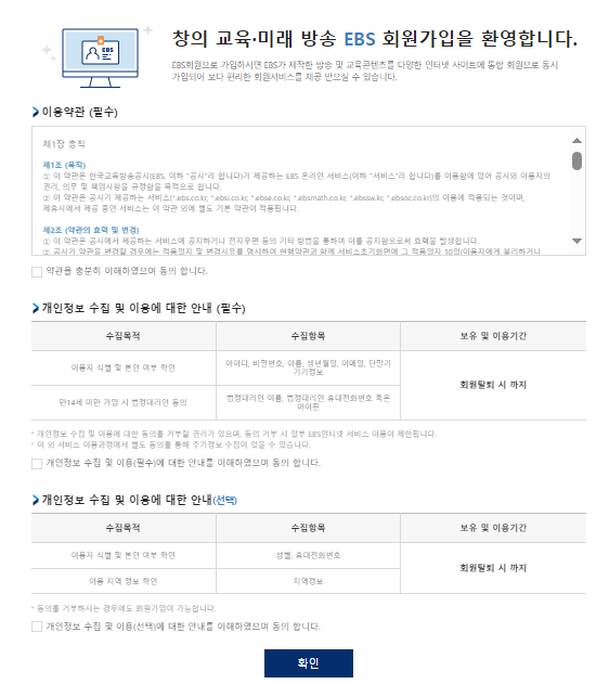 4. 회원가입을 누르면 아래와 같은 이용약관, 개인정보 동의 창이 뜹니다